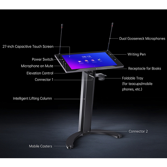 Un ordinateur intégré, deux microphones, et un écran tactile de 27 pouces avec une puissance de calcul 6Tops — tout dans un seul appareil. Le pupitre numérique avec écran LCD offre un style professionnel élégant, éliminant le besoin de préparer un manuscrit ou de transporter un ordinateur pour les discours, rapports ou enseignements.