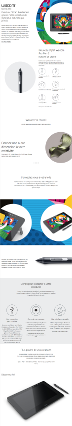 Wacom Cintiq Pro 13 Creative Pen Display 13 Taille 360 x 235 x 13,9 mm (14,2 x 9,3 x 0,55 po) Poids 1,1 kg haute luminosité IPS FHD panneau Rapport de contraste 800: 1 Luminosité 250 cd / m2 USB-C (pour des performances optimales), Mini DisplayPort ou HDMI utilisant le Wacom Link Plus inclus Multi-Touch Nibs 10 (6 standard, 4 feutre 3 ports USB C PC: Windows® 7 ou version ultérieure Mac: OS X® 10.11 ou version ultérieure Pour une connexion Full HD: